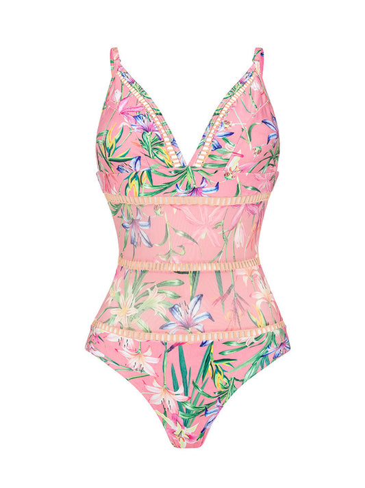 Pink Lace Flowers One-piece Swimsuit With Bathing Suit Warp Skirt