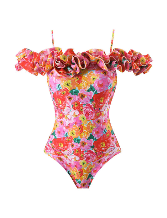 Red Off Shoulder Ruffles One Piece With Bathing Suit Wrap Skirt