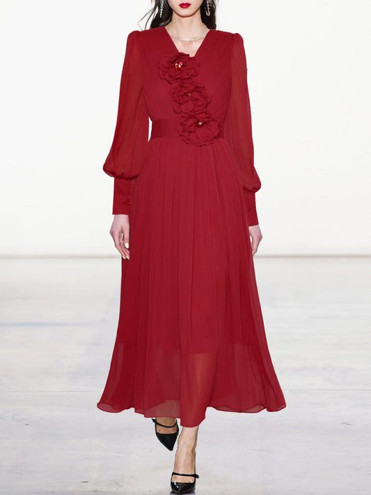 Red Lantern Flowers Long Sleeve Romantic Chiffon Dress