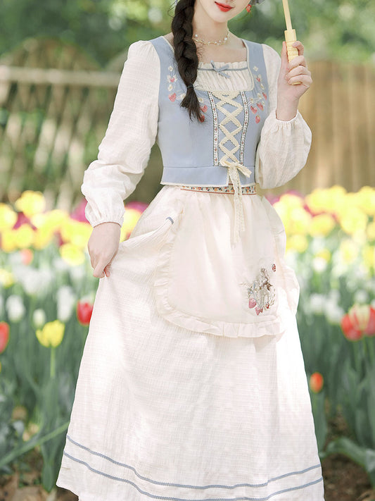 Blue Lace Square Collar Cottagecore Long Sleeve Vintage 1950S Swing Dress