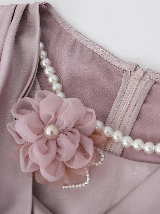White and Pink Bow Fake Two-piece Velvet Long Sleeve Vintage 1950S Swing Dress