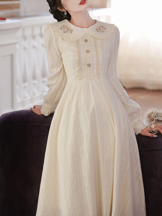 White Peter Pan Collar Long Sleeve Vintage Embroidered Cottagecore Cotton Dress