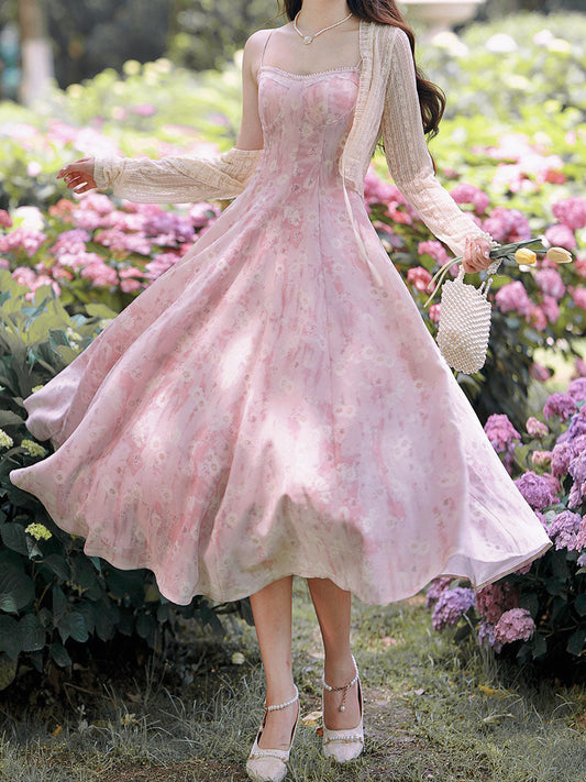 2PS Apricot Floral Print Spaghetti Strap Velvet Dress With White Knit Cardigan Dress Suit