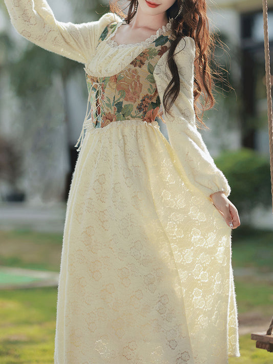 White Square Collar Cottagecore Corset Long Sleeve Vintage 1950S Swing Dress