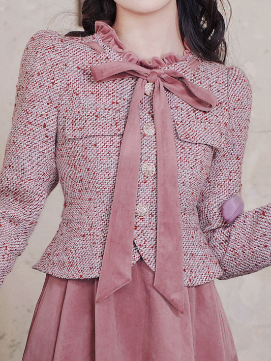 Pink and Purple Bow Fake Two-piece Velvet Long Sleeve Vintage 1950S Swing Dress