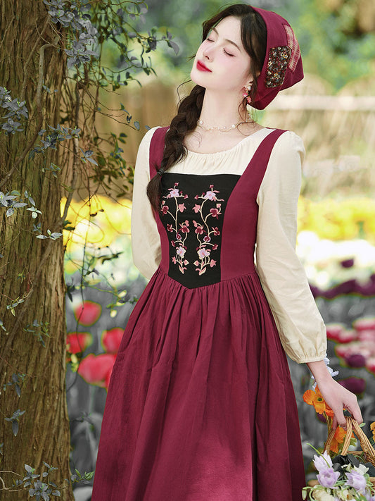 Wine Red Square Collar Cottagecore Long Sleeve Vintage 1950S Swing Dress With Scarf