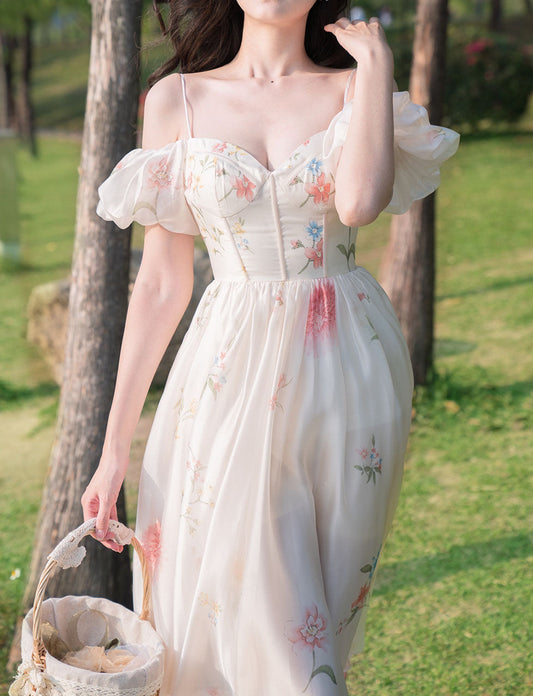 White Floral Print Off Shoulder Corset Spaghetti Strap 1950S Vintage Dress