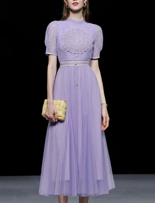 Lilac Flower Embroidery Crew Neck 1950S Barbie Party Dress