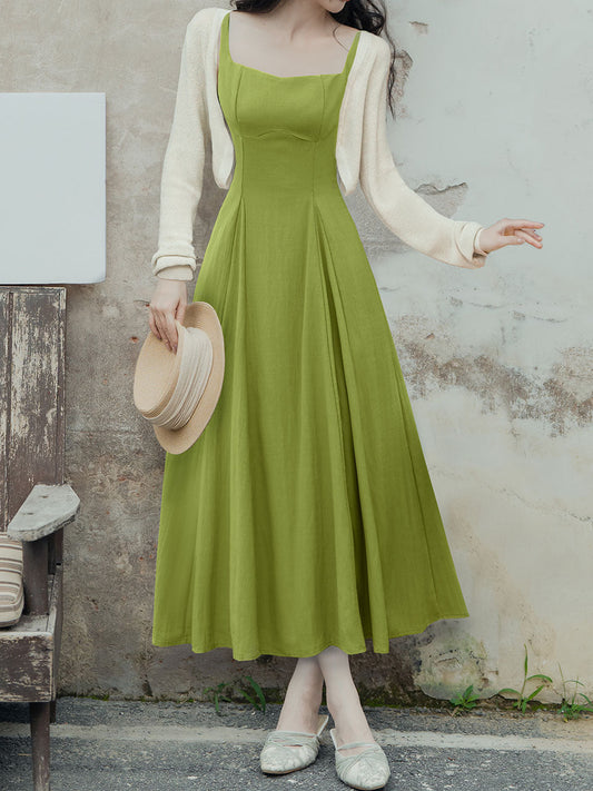 2PS Green Strap 1950S Vintage Dress With Long Sleeve Cardigan