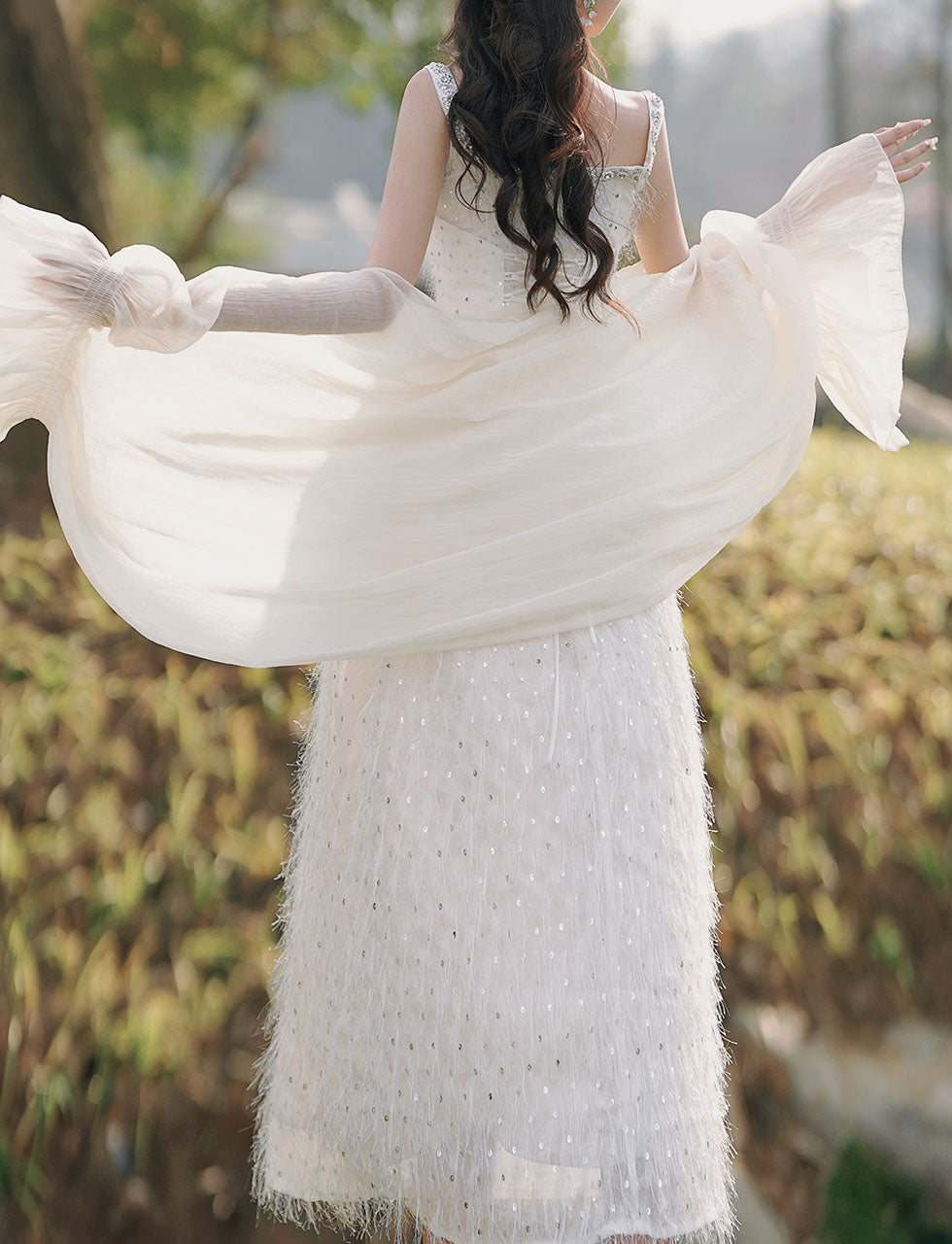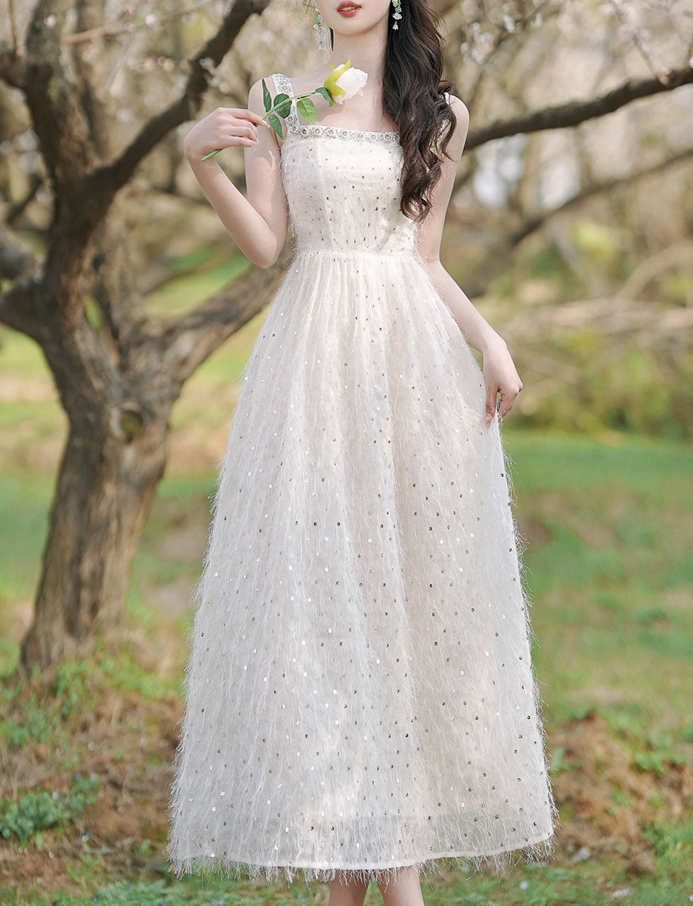 2PS Apricot Cardigan With Tassel Sequined Strap 50S Vintage Dress Set