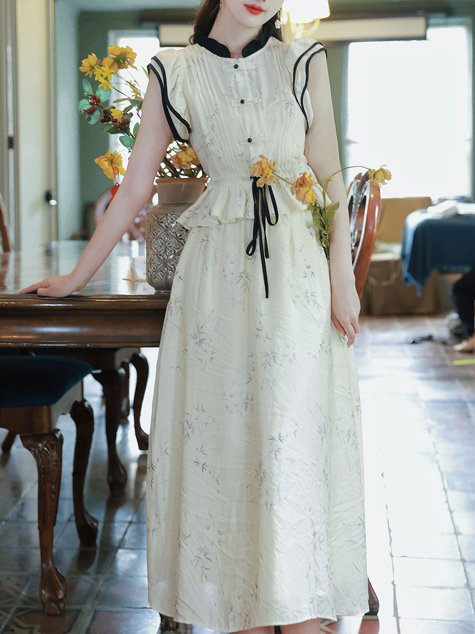 2PS Apricot Butterfly Sleeves Contrast Ruffled Lace-up Top With Skirt Vintage 1950S Suit