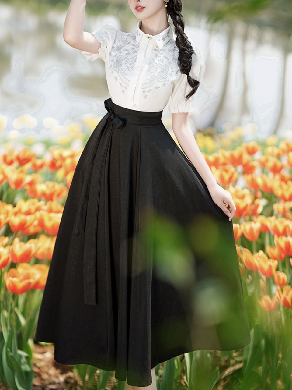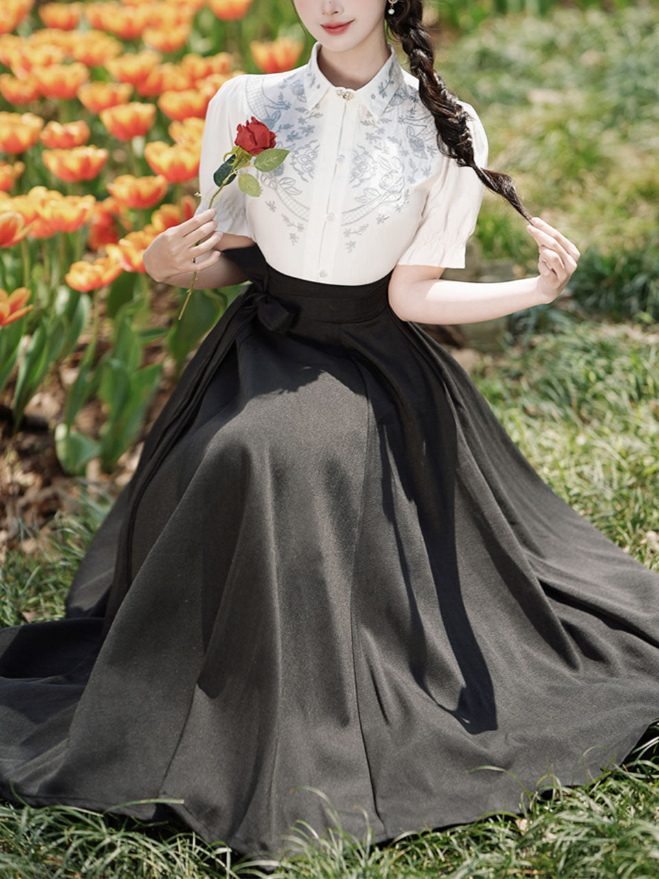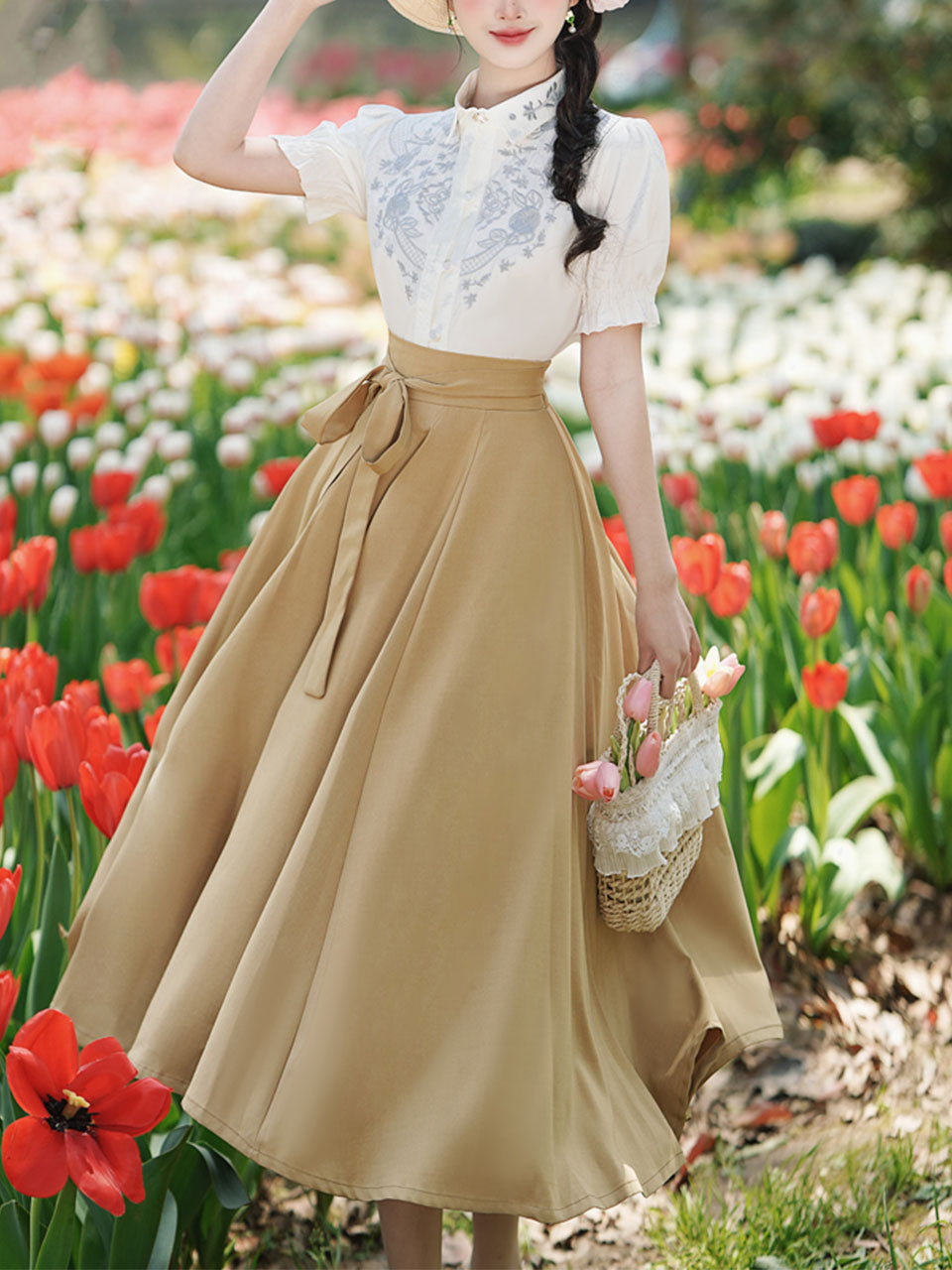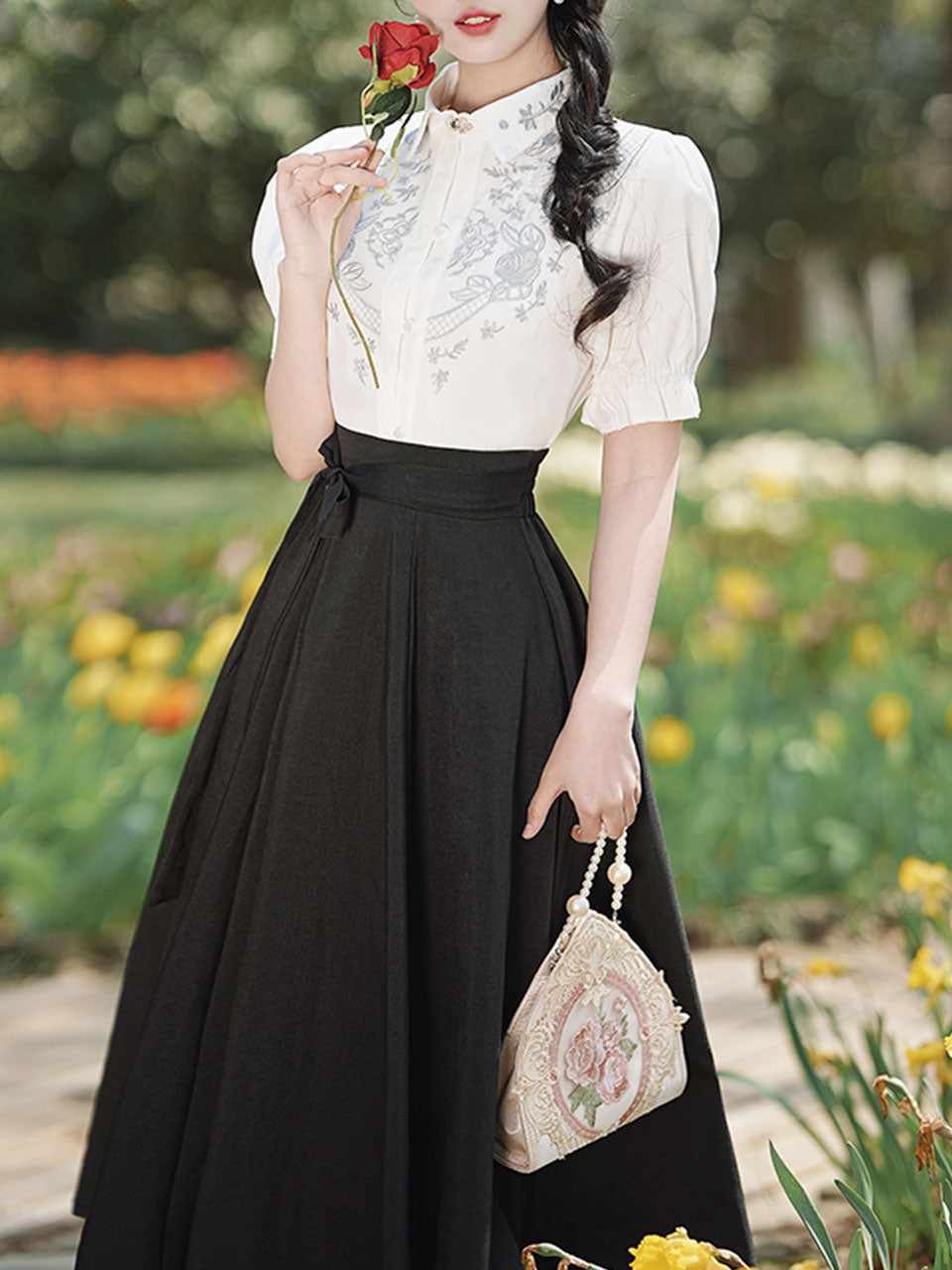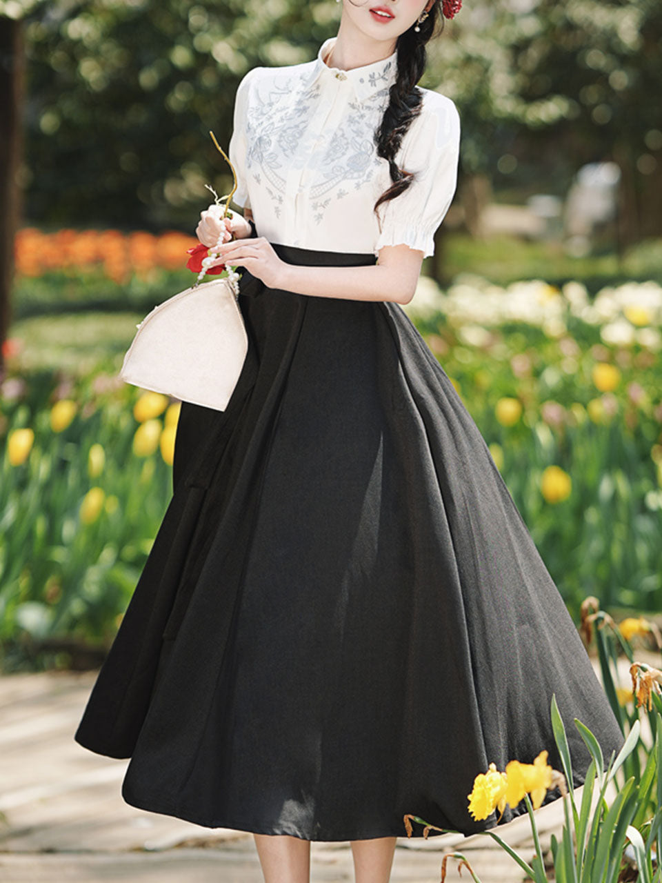 Baby Blue 1950S Vintage Embroidered Short Sleeve Shirt And Swing Skirt Set
