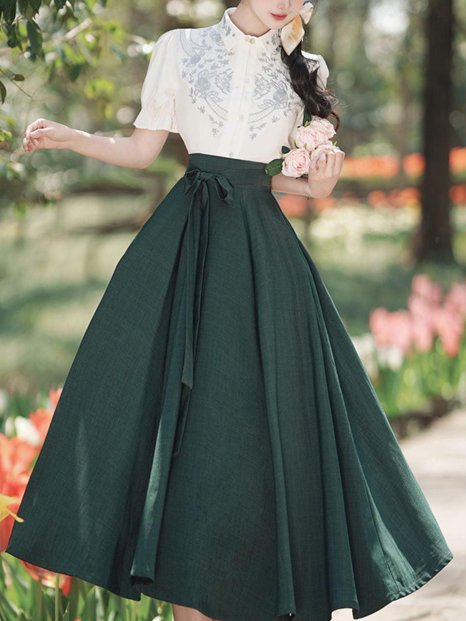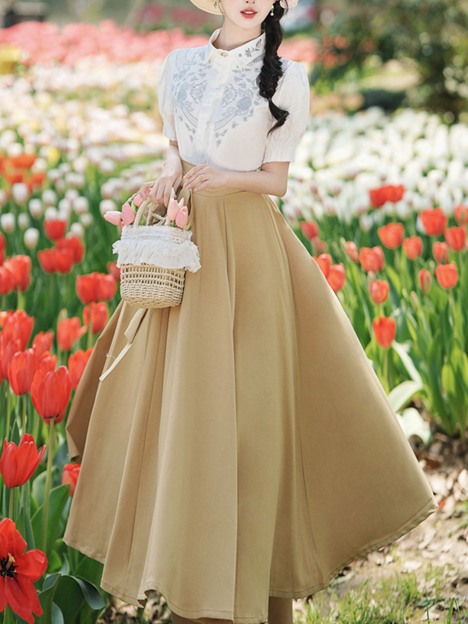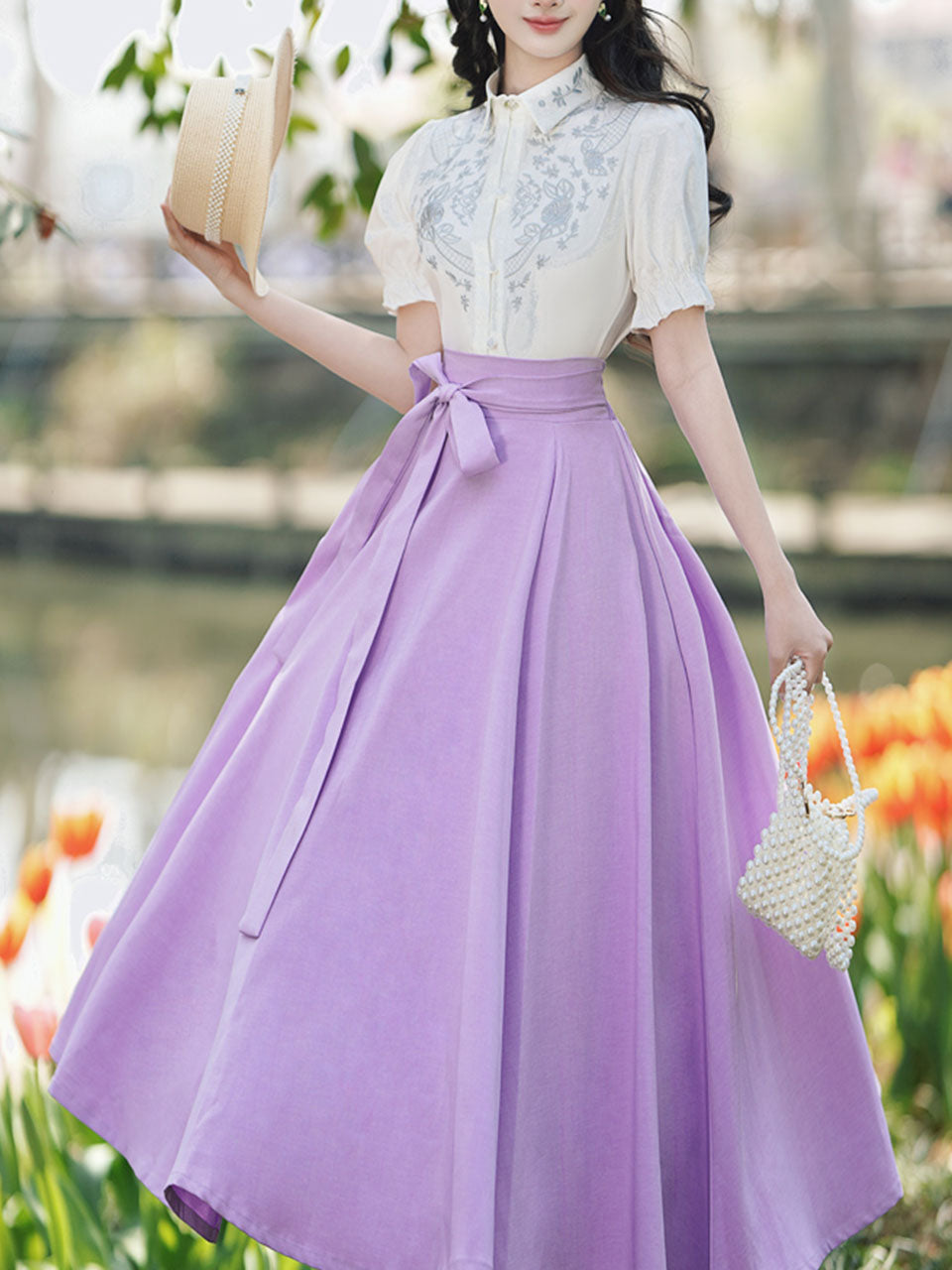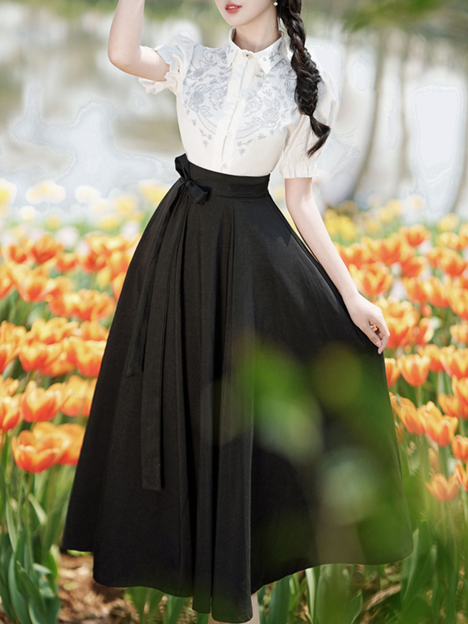 Baby Blue 1950S Vintage Embroidered Short Sleeve Shirt And Swing Skirt Set