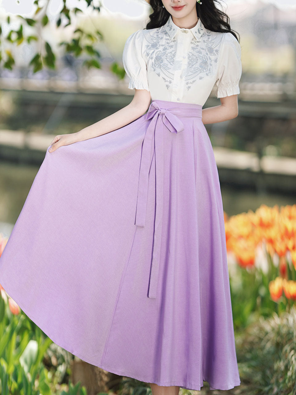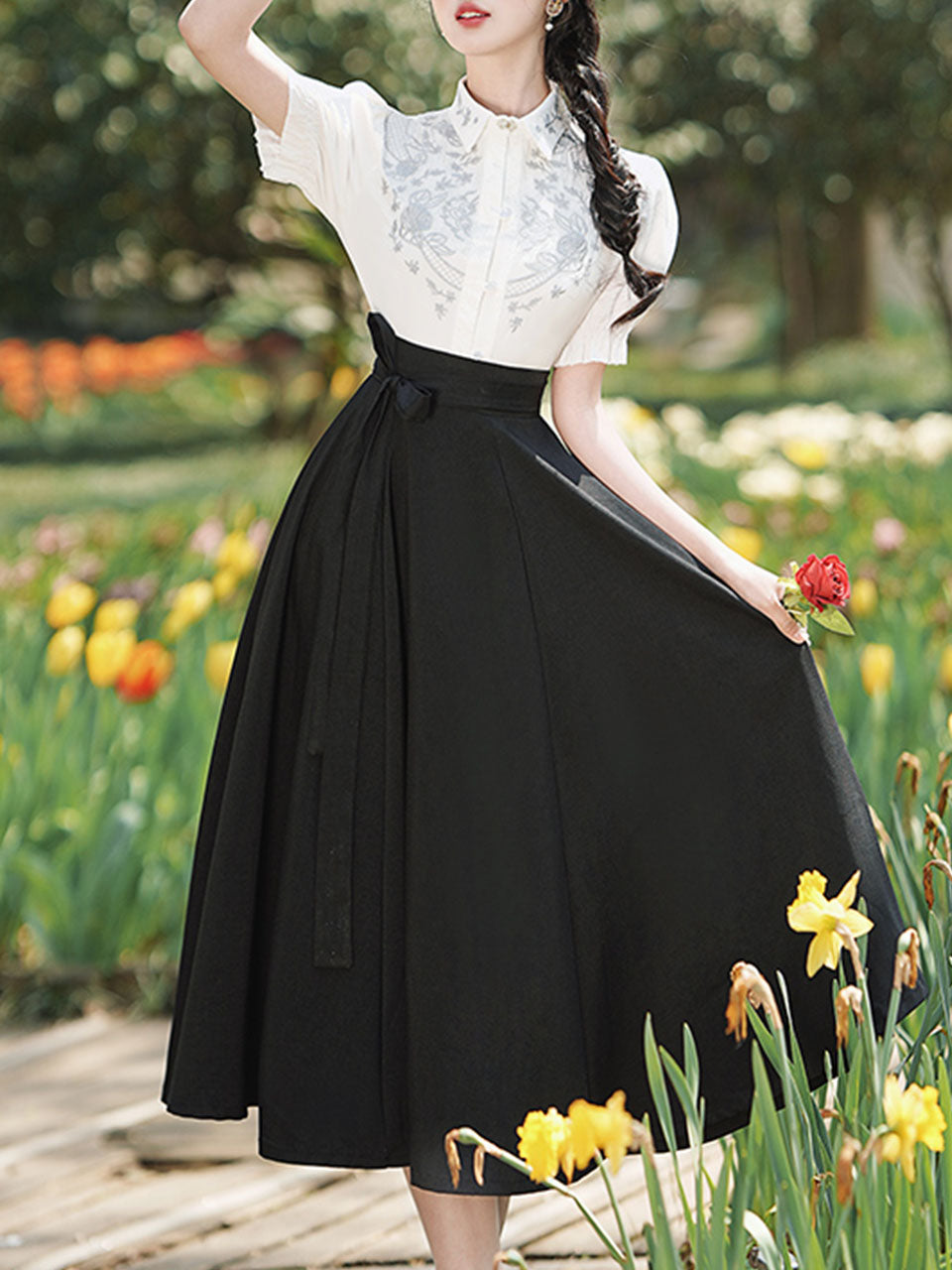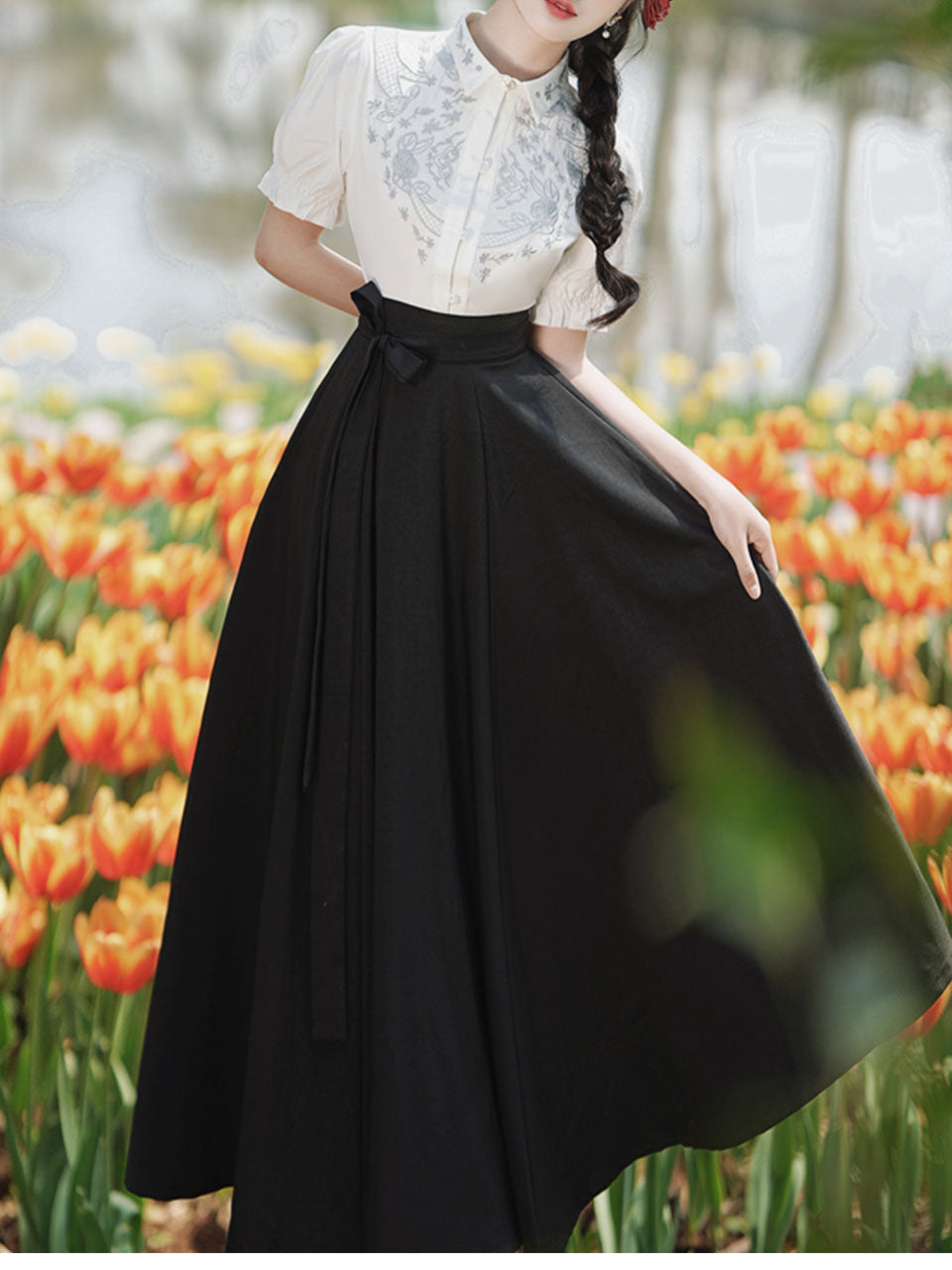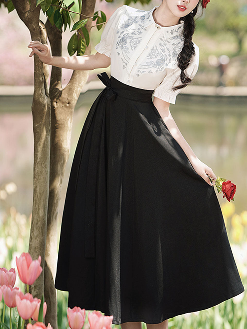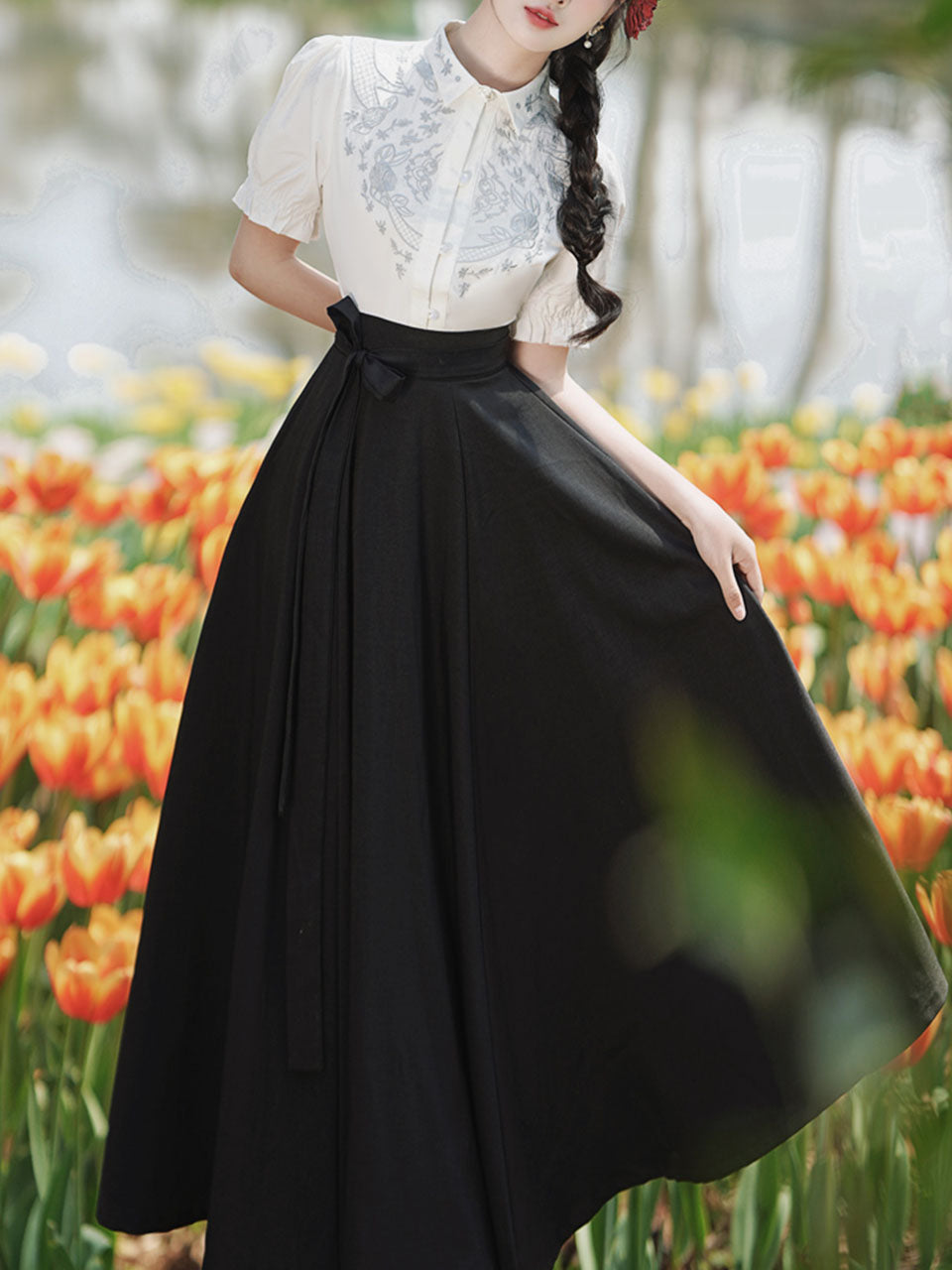 Baby Blue 1950S Vintage Embroidered Short Sleeve Shirt And Swing Skirt Set