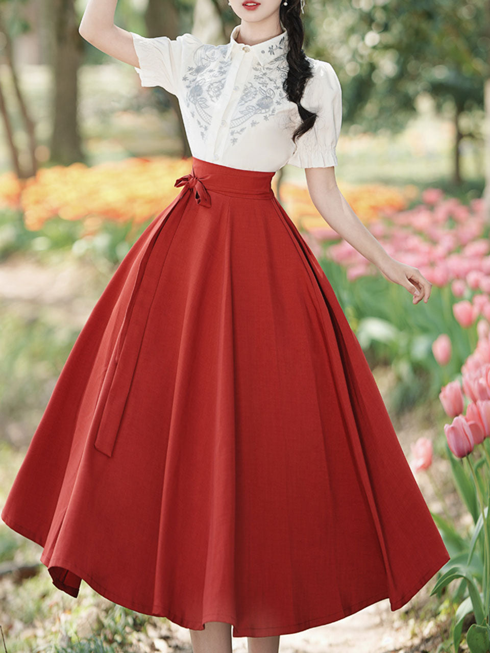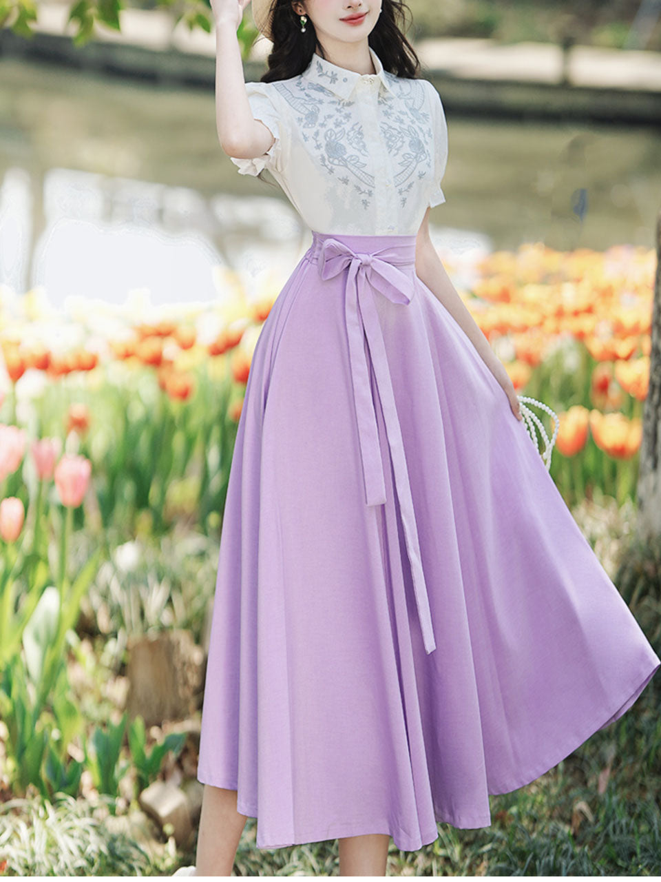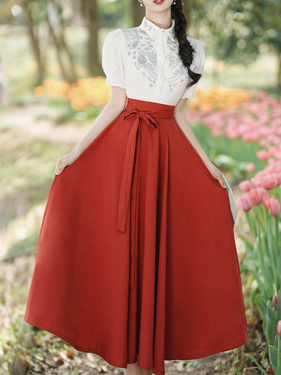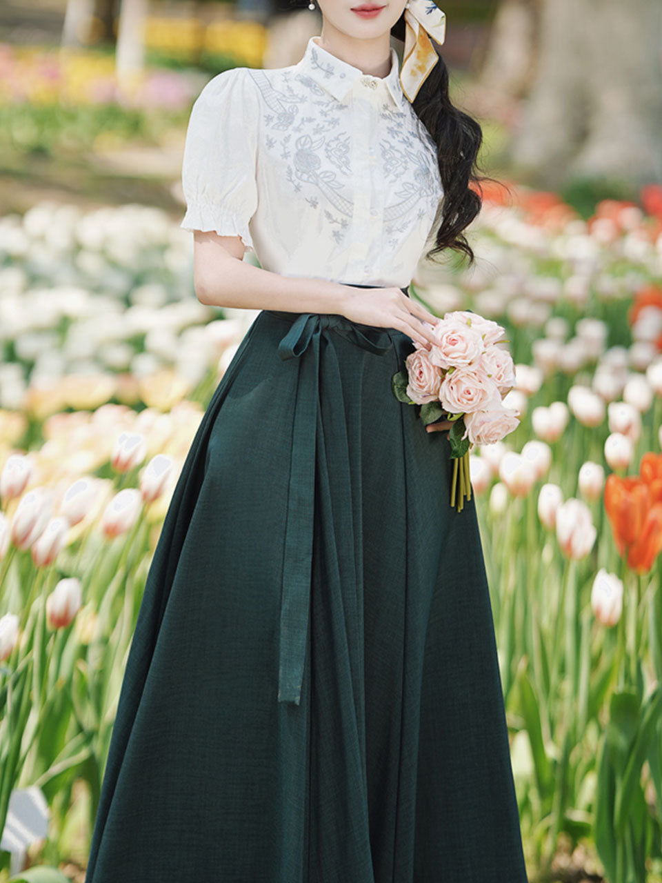 Baby Blue 1950S Vintage Embroidered Short Sleeve Shirt And Swing Skirt Set