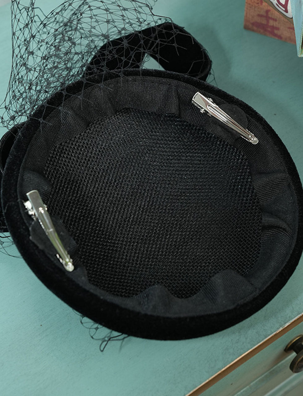 Black Handmade Bow Birdcage Veil Vintage Wool Beret