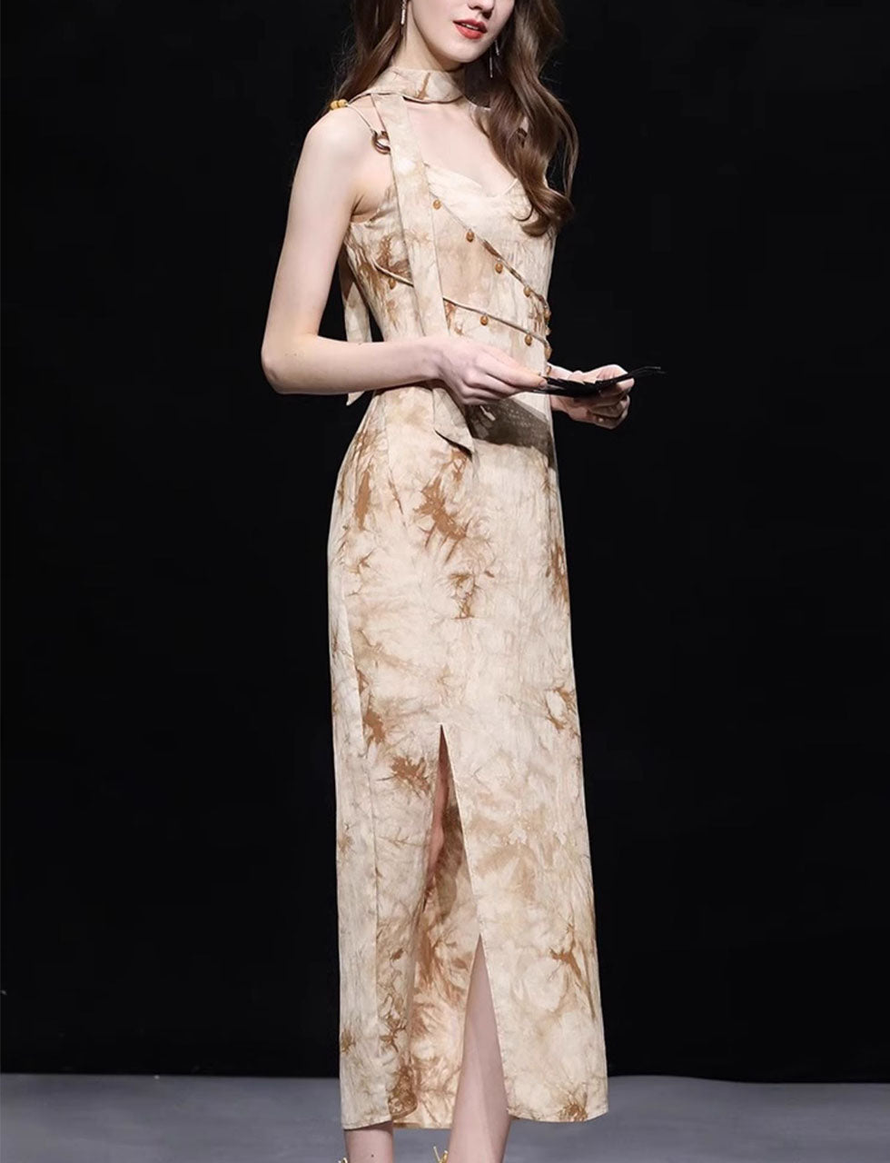 Brown Floral Print Spaghetti Straps Maxi Dress