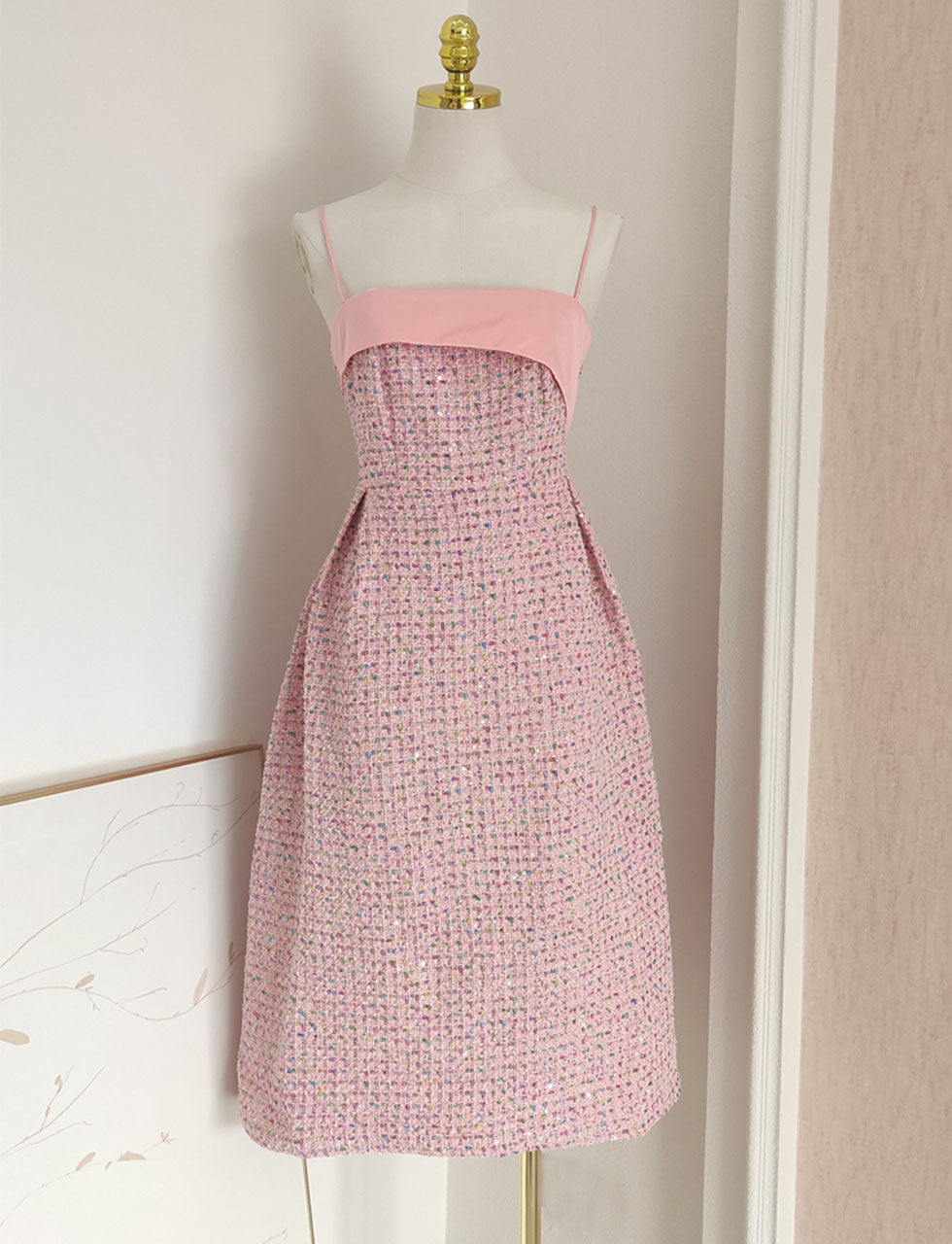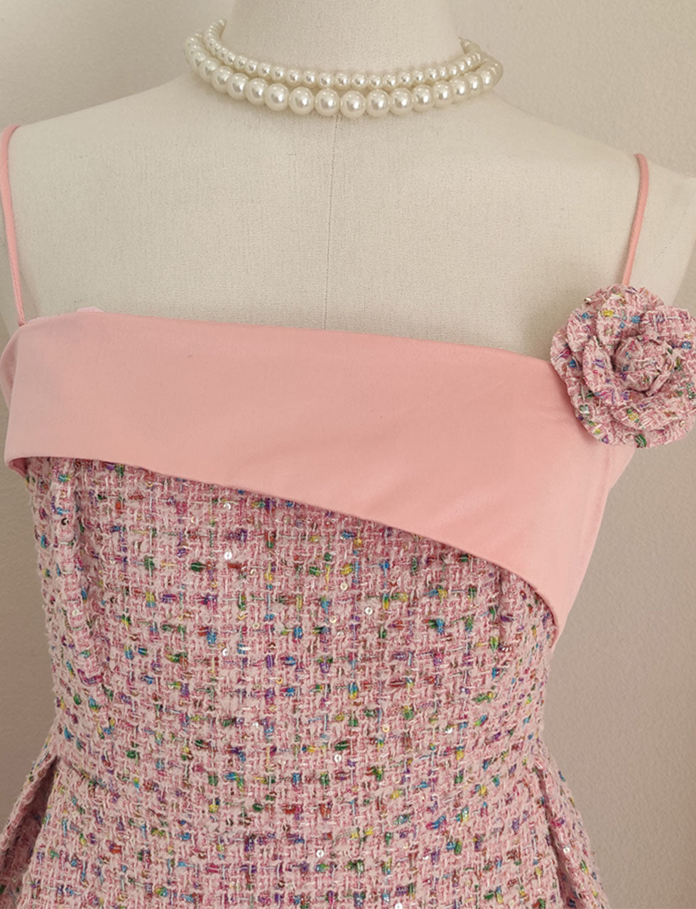 Pink Camellia Flower Spaghetti Strap Tweed Party Dress