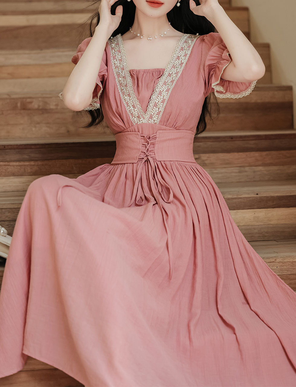Pink Handmade Rhinestone Lace-up Belt Edwardian Revival Dress