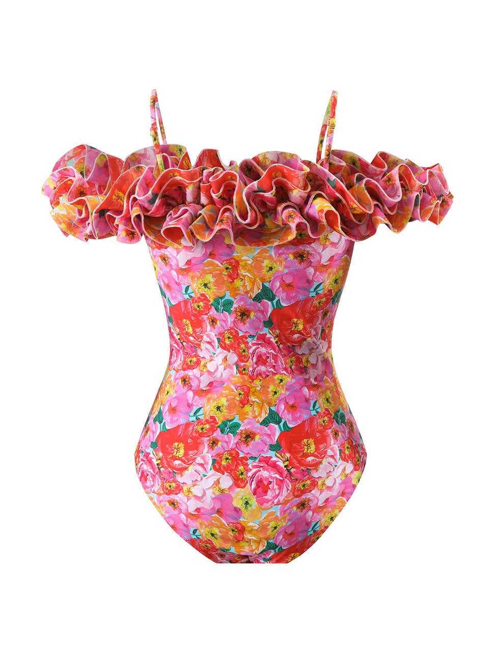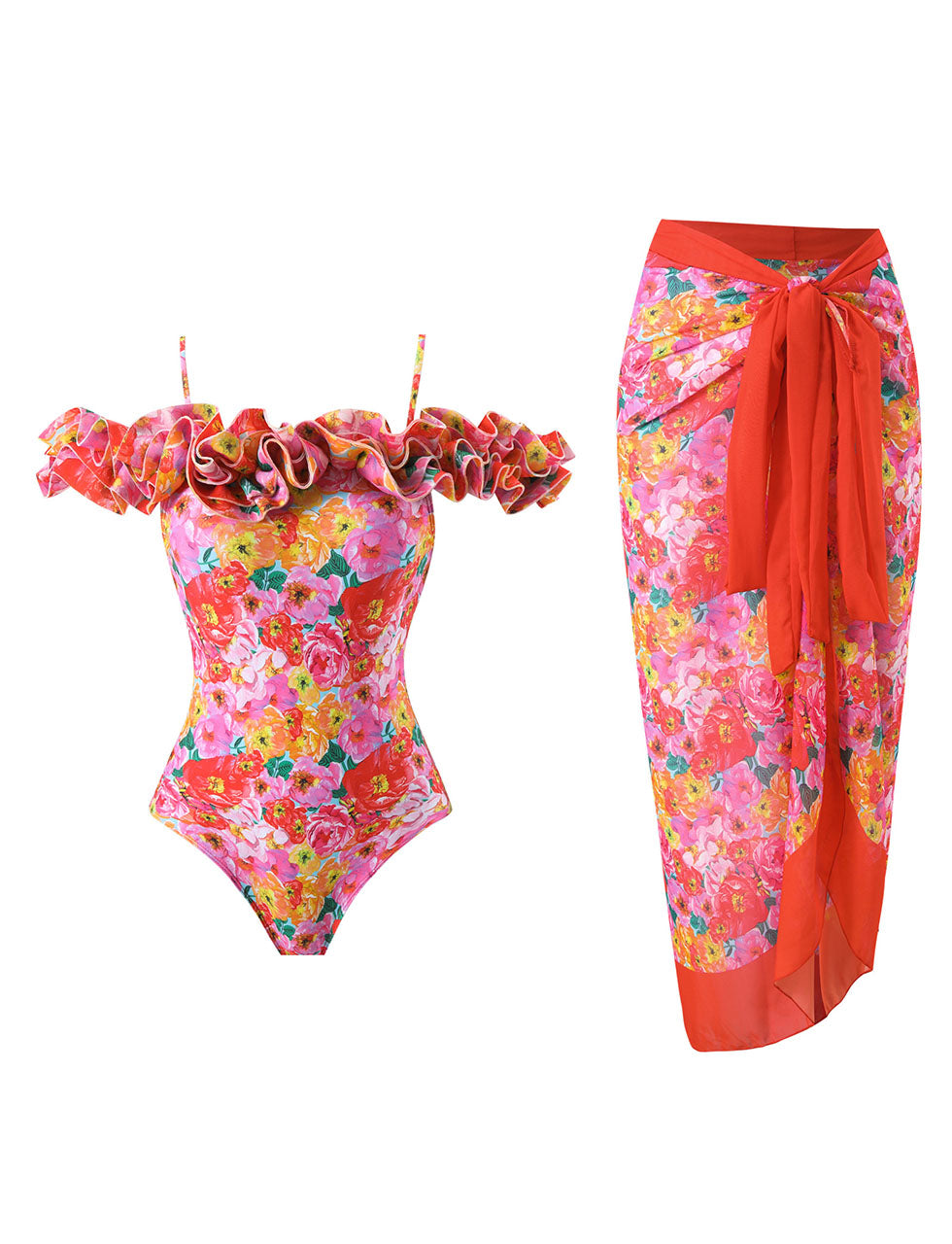 Red Off Shoulder Ruffles One Piece With Bathing Suit Wrap Skirt