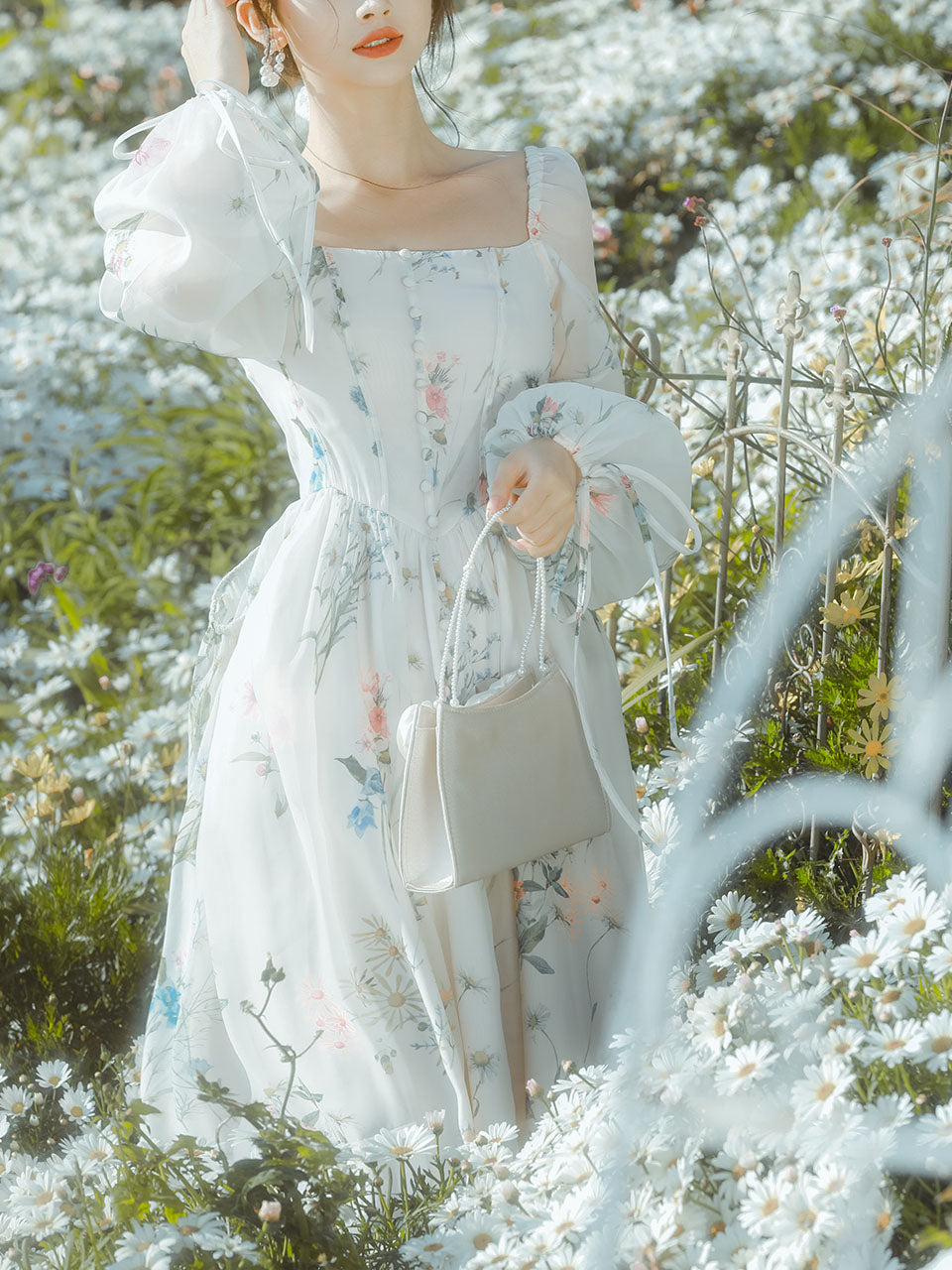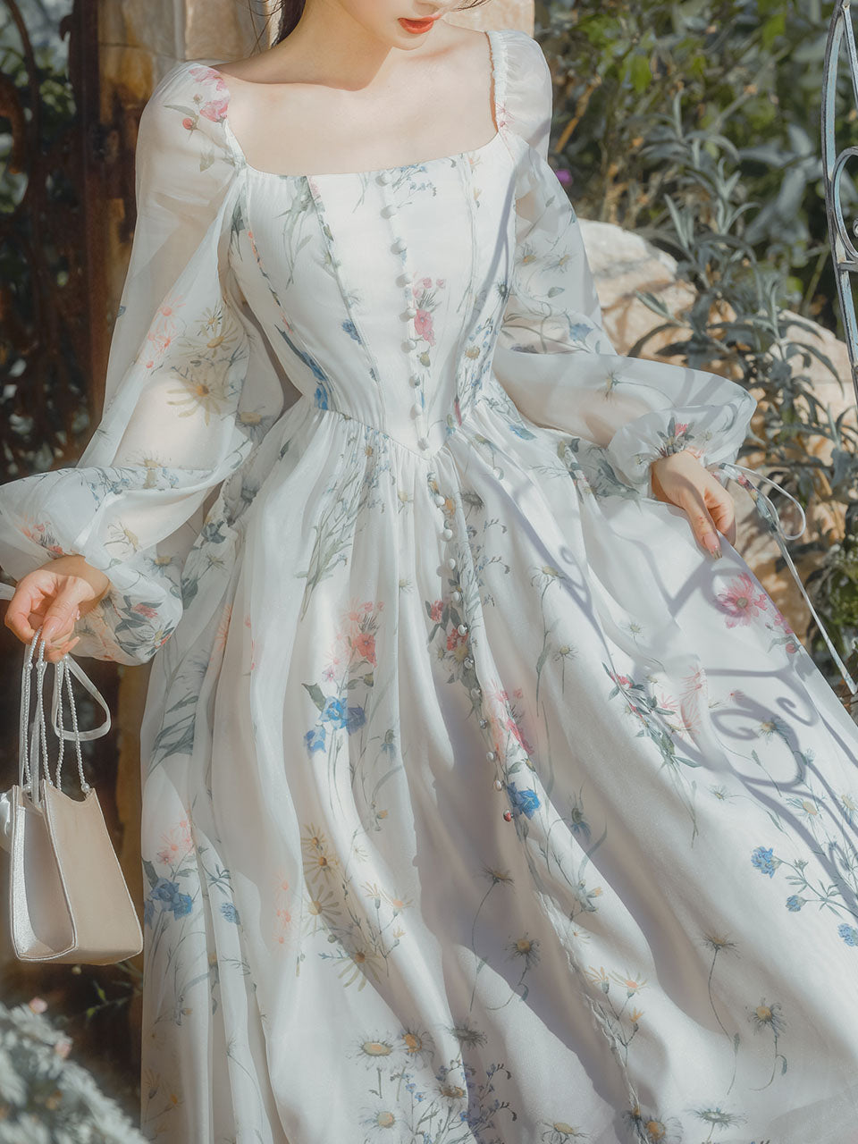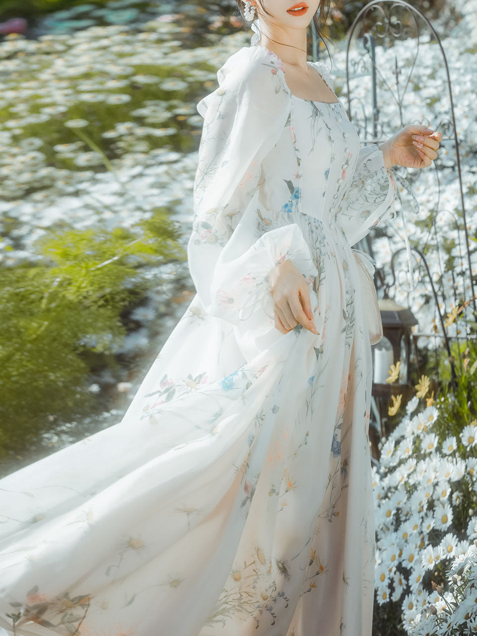 White Square Collar Lace Floral Print Long Sleeve Vintage 1950S Dress