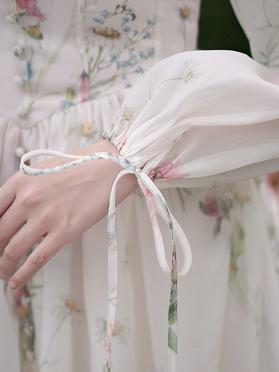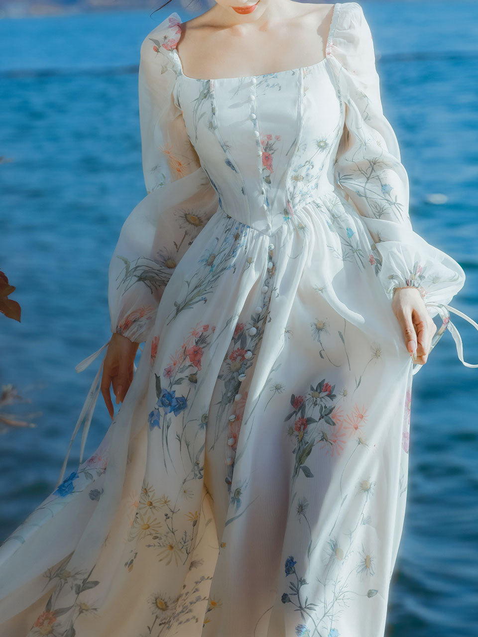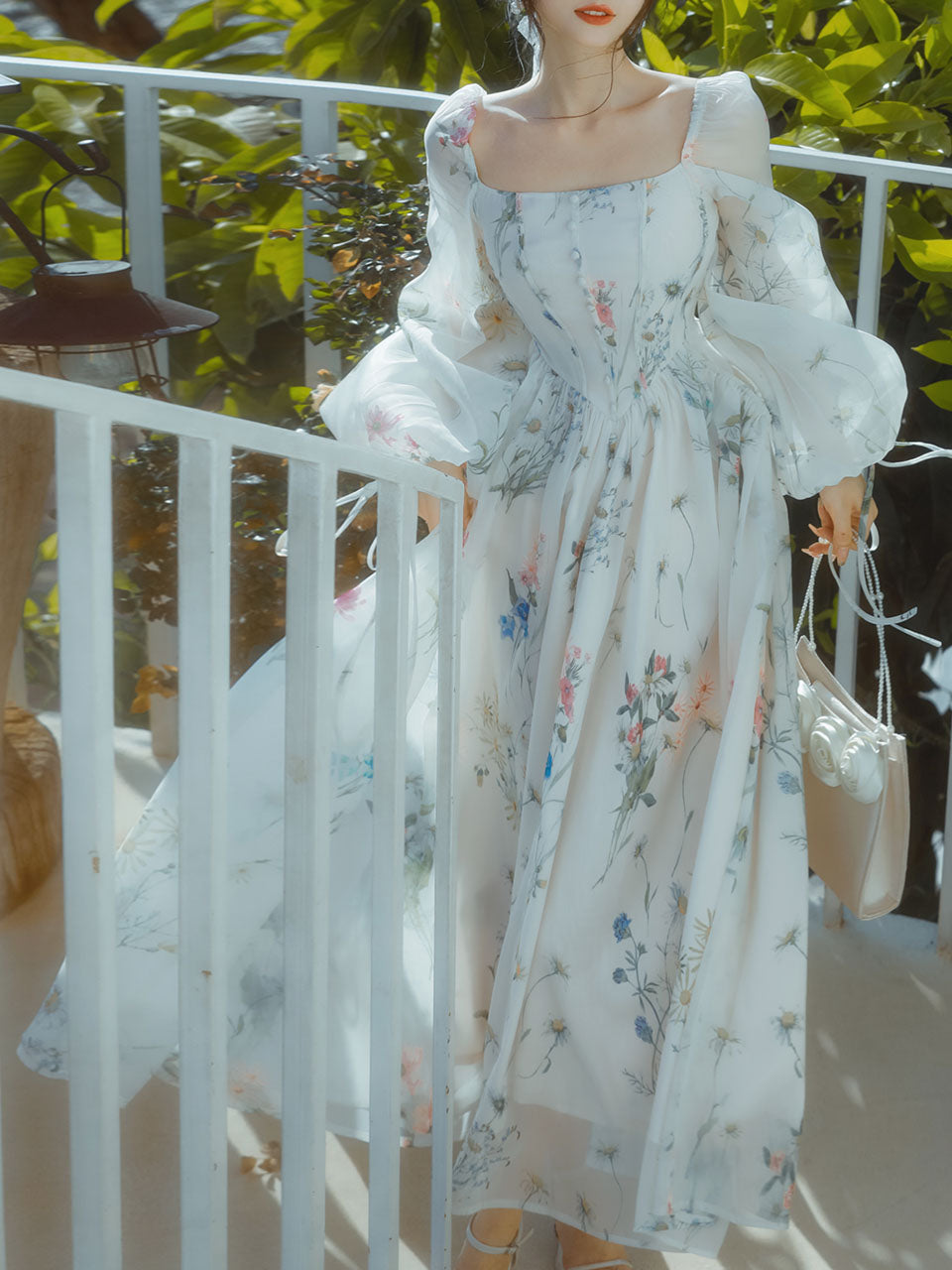 White Square Collar Lace Floral Print Long Sleeve Vintage 1950S Dress